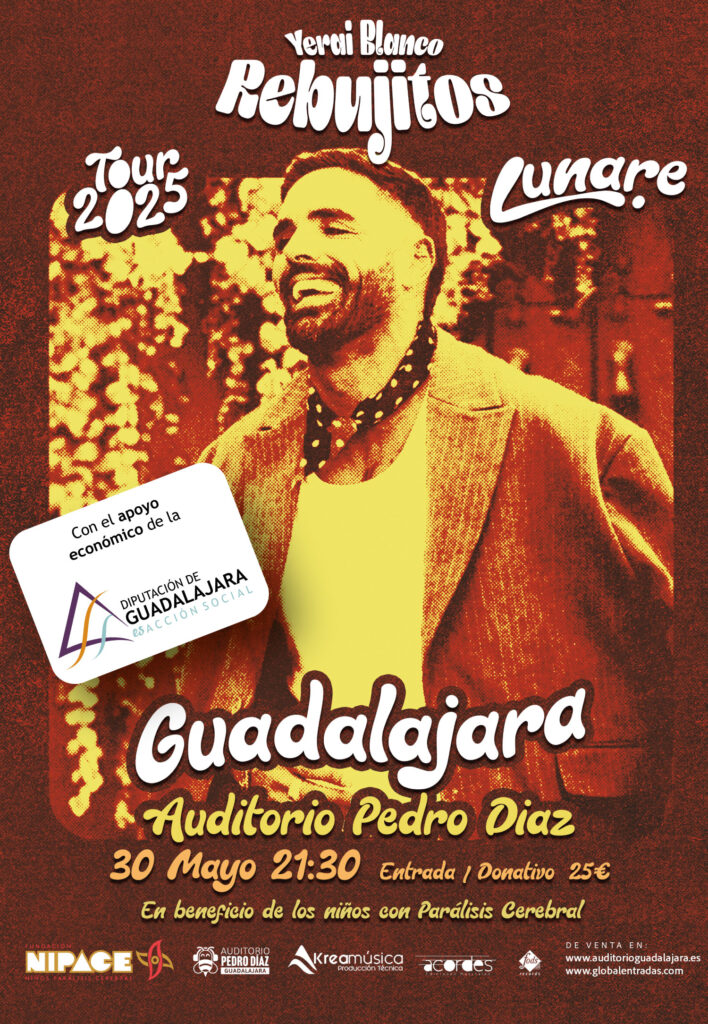 Fundación NIPACE organiza un concierto solidario con REBUJITOS (Yerai Blanco) como parte de su Tour Lunare 2025. Este evento especial tendrá lugar el próximo 30 de mayo en el Auditorio Pedro Díaz de Guadalajara, a las 21:30 h, con apertura de puertas a las 19:30 h.